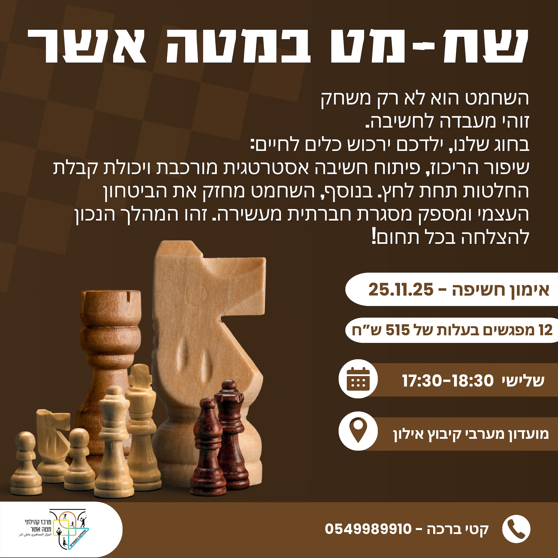 שיפור הריכוז, פיתוח חשיבה אסטרטגית מורכבת ויכולת קבלת החלטות תחת לחץ. בנוסף, השחמט מחזק את הביטחון העצמי ומספק מסגרת חברתית מעשירה. זהו המהלך הנכון להצלחה בכל תחום!