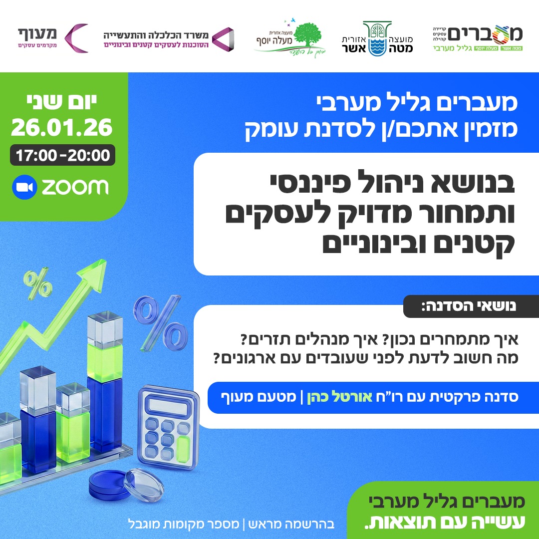 סדנה ממוקדת בת 3 שעות, בשיתוף מעוף, שתעשה לכם סדר בכספים ותעניק לכם כלים יישומיים לבניית עסק יציב ורווחי -במיוחד מול גופים וארגונים.