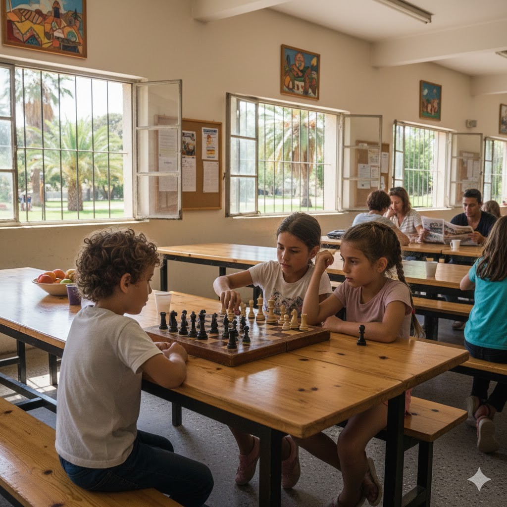 משחקים משותפים: שולחנות פתוחים למשחק חופשי, אתגרי חשיבה וחידות שחמט לכל הרמות.