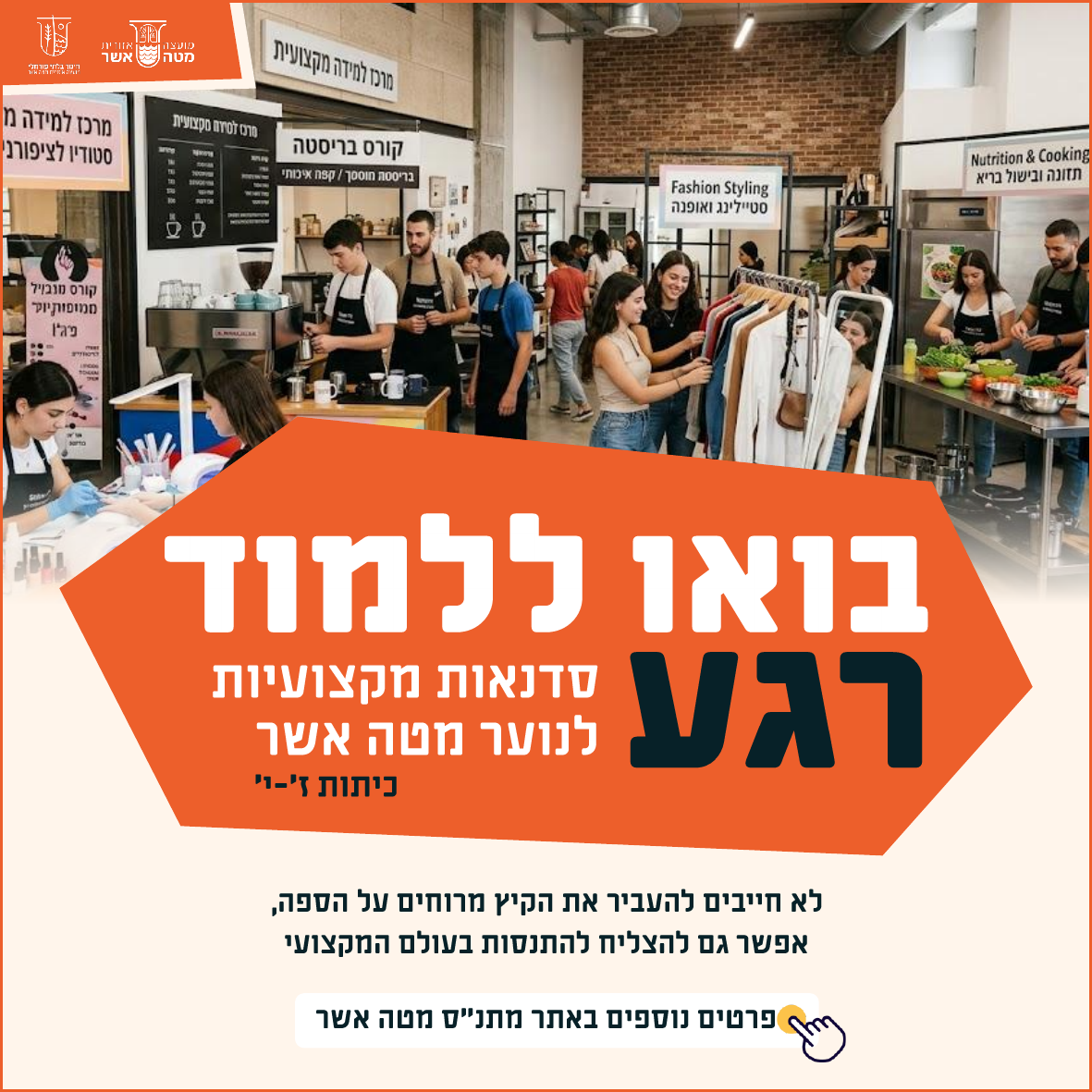 המחלקה לחינוך בלתי פורמלי במטה אשר מזמינה אתכם לקחת רגע וללמוד באחד מהקורסים שלנו שיוציאו אתכם עם תעודה מקצועית לקראת הקיץ.
